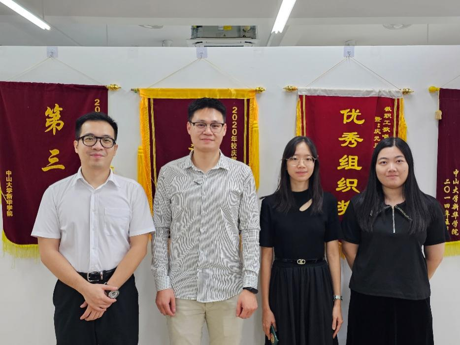 实践部主任李思扬(左一)、基础西班牙语教研室主任符晓强(左二)、美特柏公司总经理吴静欣(右二)、人事主管曹嘉颖(右一)交流合影