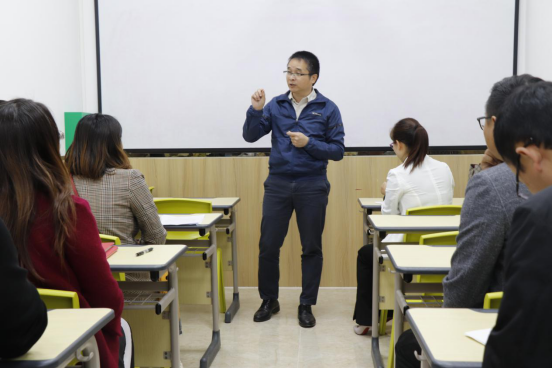 我院教师团与学易优的教培人员进行了“一对多”的教学交流,由执教小学部的莫崇春老师分享她多年来一线教学管理经验。她表示必须爱孩子,尊重孩子,要充分揣摩孩子心理,学会与其搞好关系,她还强调管理的重要性,具体的做法是建立非固定小组,即根据孩子的兴趣或其他特性来分设小组,这样有利于激发其积极性。