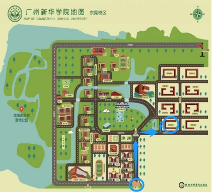 1、入校路线:请考生于考试前一天提前熟悉到校交通路线,校外考生请从广州新华学院东莞校区(南门)入校。入校后请按以下蓝色指引路线前往考场: